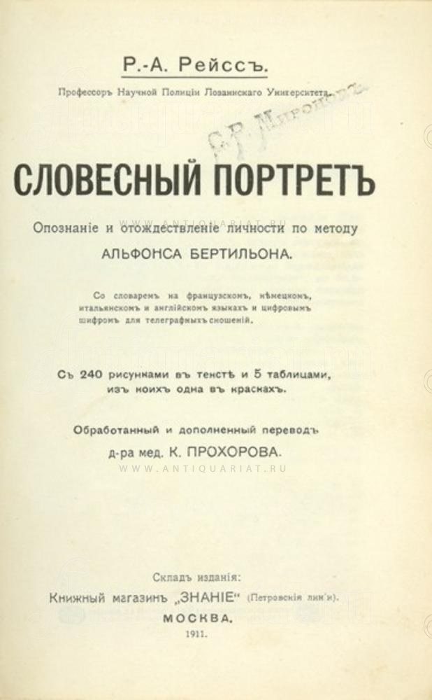 Опознание и отождествление личности по методу Альфонса Бертильона. Со словарем на французском, немецком, итальянском и английском языках и цифровым шифром для телеграфных сношений.