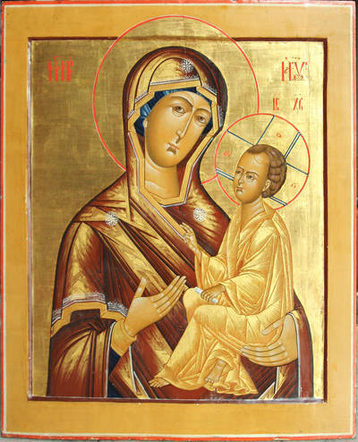 Иконографически - тип Богоматери Одигитрии Перивлепты ("Прекрасной"), получивший на Руси название "Тихвинской".
