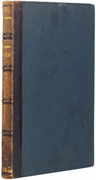 Во владельческом полукожаном переплете, с тиснением по корешку фамилии автора, названия книги, а также суперэкслибриса «Е.П.». В хорошем состоянии, потертости по корешку. На форзаце 2б владельческие пометы, штампы. Ляссе. На титульном листе штамп-экслибрис: «Покупка и продажа держанных книг Е.А. Петровой. В.О. 5 линия, д. № 16». Блок преимущественно чистый, редкие владельческие пометы карандашом