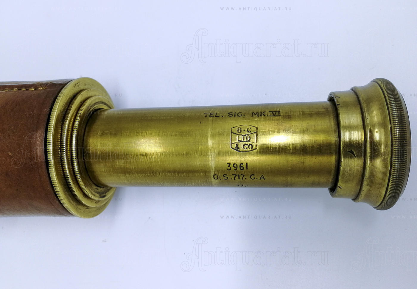 Подзорная труба имеет 4 колена, выпущена фирмой Бродхерста Кларксона, имеет штамп военной стрелы и выгравирован «TEL». SIG. MK.VI, (логотип BC & Co. Ltd), 3961, O.S. 717 GA». Внизу широкая стрелка - этот символ традиционно используется в геральдике, особенно в Англии, а позже - британским правительством для обозначения государственной собственности.