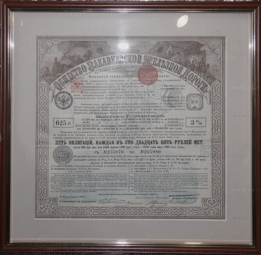 На одном листе 5 облигаций с № 235976 по № 235980 в 125 рублей мет. каждая, всего на сумму 625 рублей мет. Облигации Общества Закавказской железной дороги, выпущенные в 1882 г. согласно Высочайше утвержденному положению Комитета Министров для увеличения капитала Общества, что требовалось для сооружения Батумского и Бакинского участков.