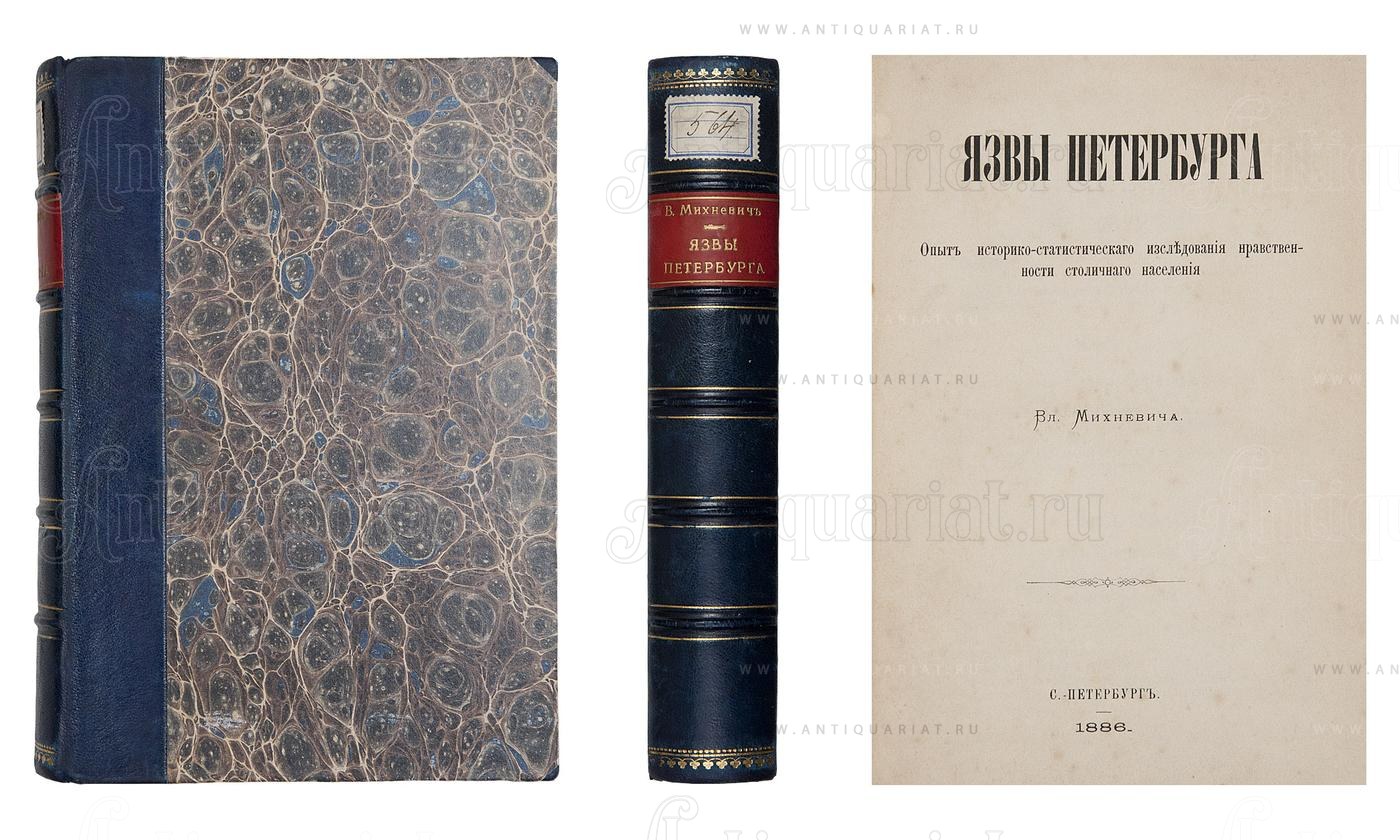 Опыт историко-статистического исследования нравственности столичного населения. — СПб., 1886. — [4], XXX, [2], 542 с. — (Исторические этюды русской жизни. Т. 3). В индивидуальном полукожаном переплёте. Наклейка на корешке, фоксинги. Автор, журналист и историк быта Владимир Осипович Михневич (1841-1899), рассказывает об элементах петербургского дна, уголовных преступлениях, нищенстве, проституции и других социальных язвах, опираясь на данные полицейской статистики, тексты судебных отчетов и собственный богатый репортёрский опыт.