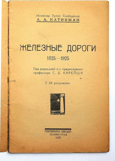 Железные дороги: 1825–1925 / Инж. пут. сообщ. А. А. Катикман; Под ред. и с предисл. проф. С. Д. Карейша.Л.: «Полярная звезда», 1925.100 с.: ил. 5000 экз. В цветной иллюстрированной издательской обложке Н. П. Акимова. Хорошая сохранность. Утрата фрагментов корешка, роспись владельца на 1 с. обложки, небольшие пятнышки на обложке.