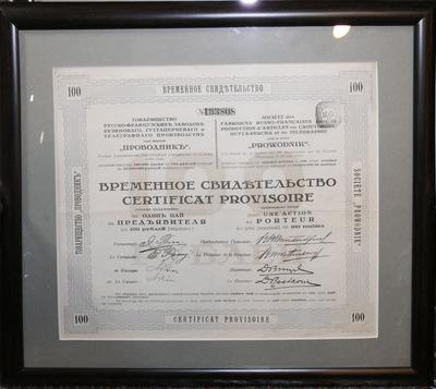 Временное свидетельство на один пай, на предъявителя, в 100 рублей. Товарищество русско-французских заводов резинового, гуттаперчевого и телеграфного производств под фирмою "Проводник".