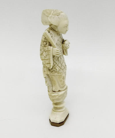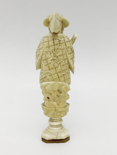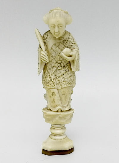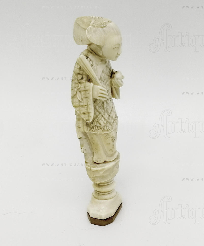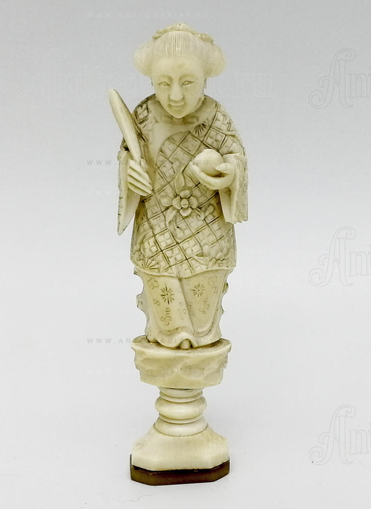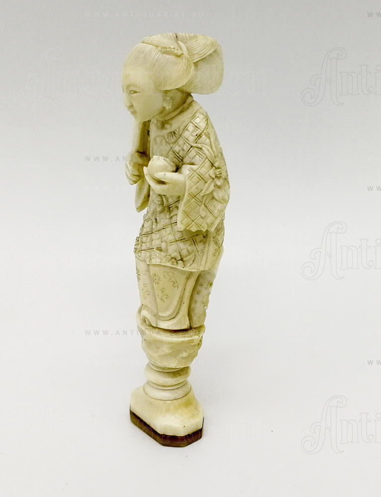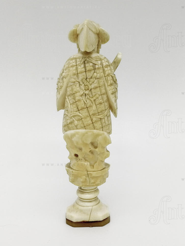 Окимоно выполнено в период правления императора Мейдзи (1868 - 1912 гг.). Работа выполнена методом резьбы из кости. подставка (пьедестал), вероятнее всего, была изготовлена позже.