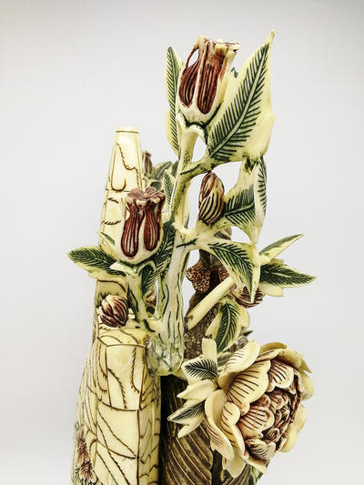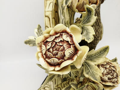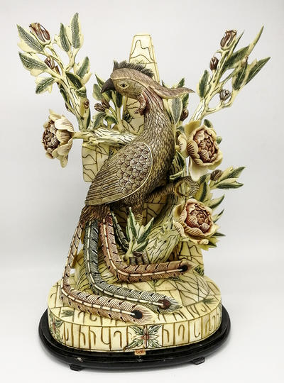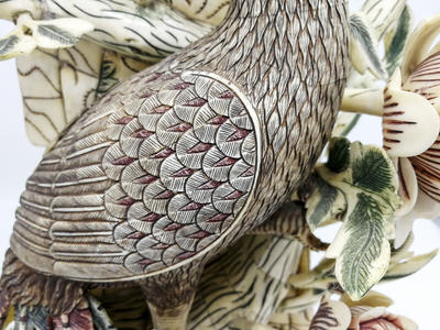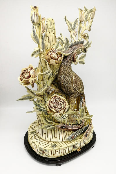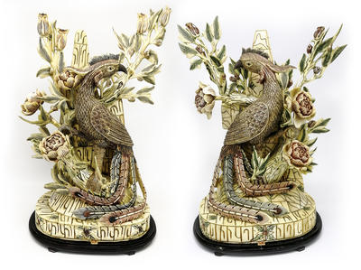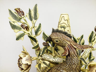 Композиция представляет собой двух павлинов, стоящих в кустах пионов. Скульптуры установлены на деревянные подставки. На каждой скульптуре иероглифы - апокрифический знак "Цяньлун" (Qianlong) - шестой маньчжурский правитель империи Цин. В течение 59 лет (1736 — 1795) правил под девизом «Цяньлун» (кит. 乾隆, буквально: «непоколебимое и славное»). Скорее всего, данная композиция была изготовлена на заказ в Китае во второй половине 18 века для Европейского Двора.