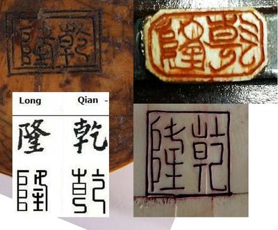 Подавляющее большинство апокрифических знаков на изделиях Цяньлун написаны "чжуаньшу" (печатью) и является наиболее распространенным и в значительной степени вытесняет обычное письмо - "кайшу". Считается, что несколько подлинных знаков кайсу датируются двумя первыми годами правления до того, как официальная печать периода Цяньлун стала стандартизированной официальным указом. Знаки печати часто пишутся железно-красным цветом, но на фарфоре под глазурью могут появляться синие или позолоченные, а также вырезанные, штампованные или рельефные.