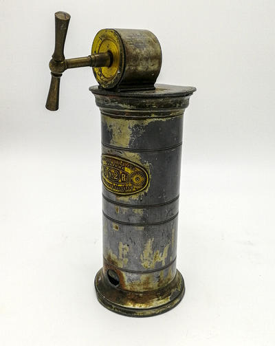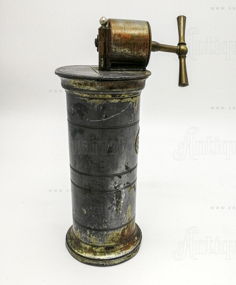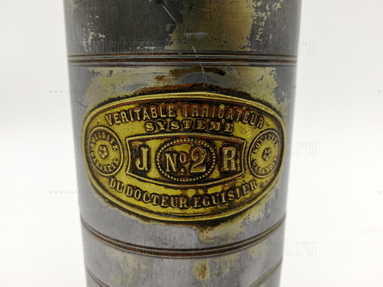 Ирригатор изготовлен из бронзового сплава с поверхностным серебрением. Резиновый шланг утрачен, серебренное покрытие имеет следы износа характерные времени. Механическая часть агрегата в исправном состоянии.