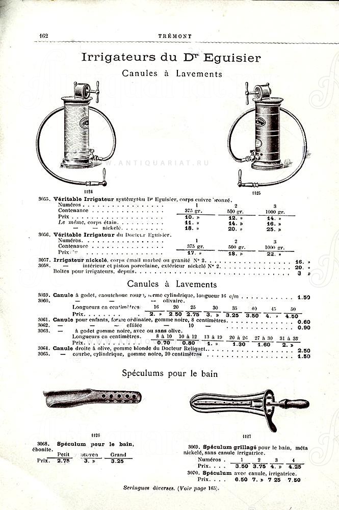 Ирригатор доктора Эгизье впервые запатентован в 1842 году. Он предлагается к продаже до 1910-х годов.
