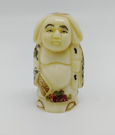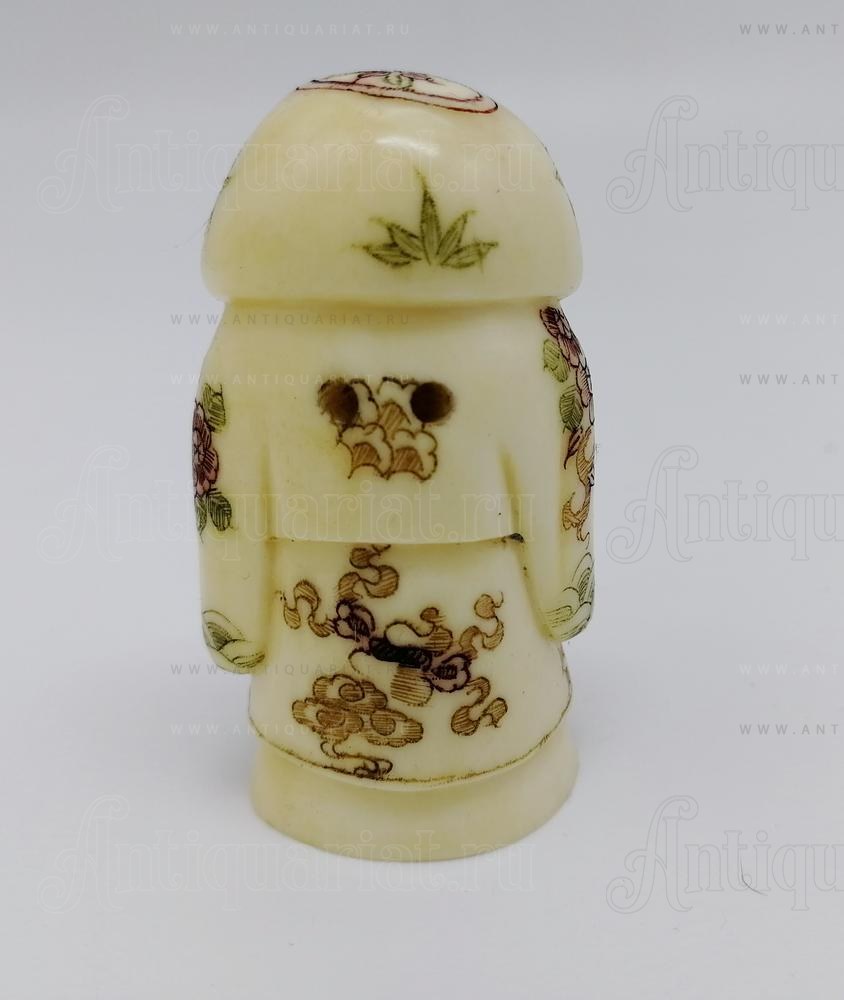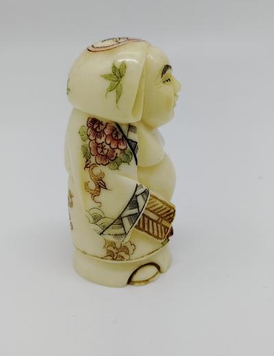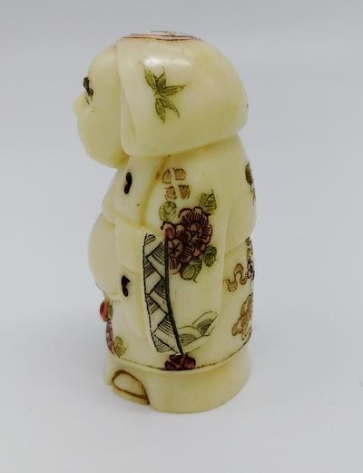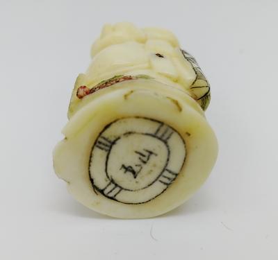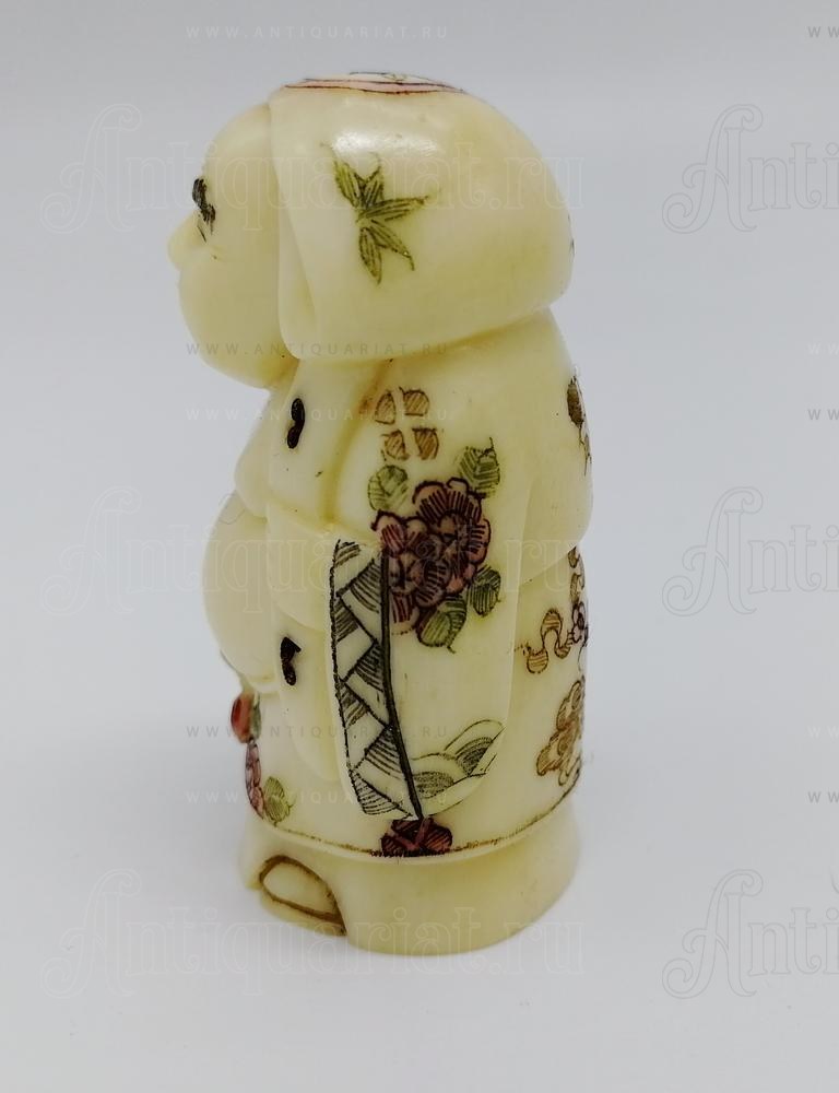 Вид нецкэ - катабори (形彫). Вырезано из кости с последующей полировкой, гравировкой и росписью разноцветной тушью (4 цвета). Имеется клеймо мастера.