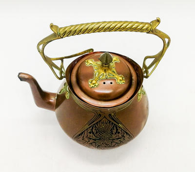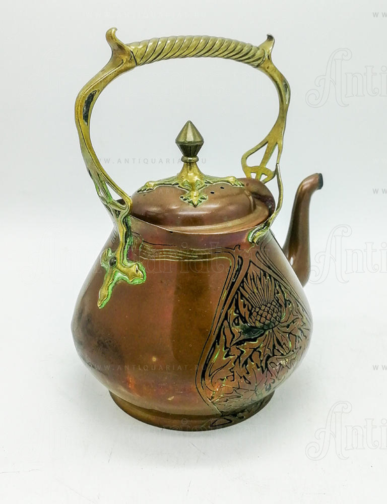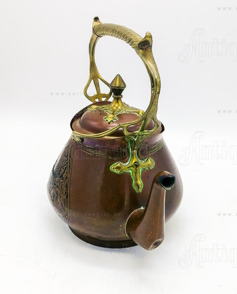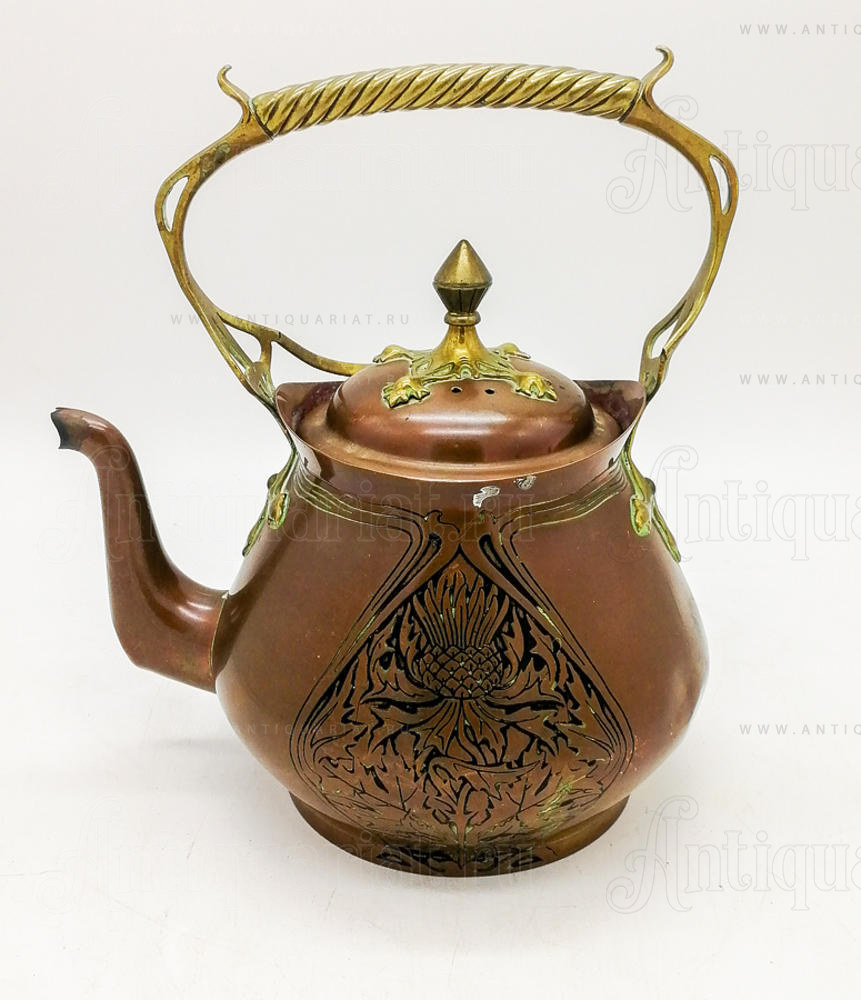 Антикварный медный чайник, произведенный Деффнером Карлом Ульрихом в начале XX века, является настоящим шедевром стиля арт-нуво (модерн). Он удивительно легок и изящен, с прекрасными изгибами и красивыми узорами на поверхности. Каждая деталь этого чайника была тщательно продумана и создана с большой любовью и мастерством. Имеется клеймо производителя на дне.