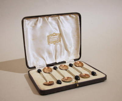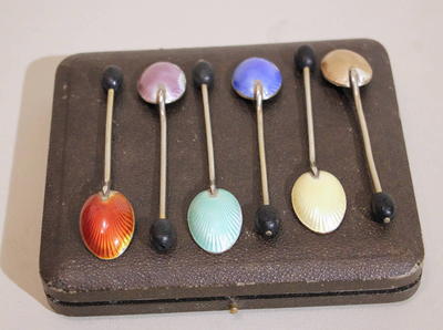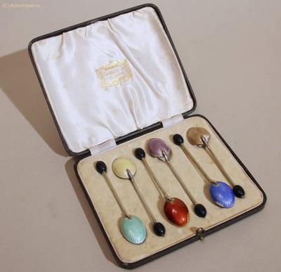 Ложки в оригинальном футляре, декорированы цветными эмалями по гильошированному фону.