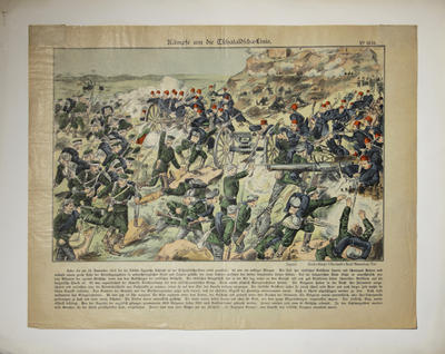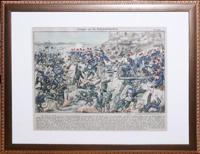 На линогравюре(?) изображено Чаталджинское сражение между болгарскими и турецкими войсками с 17 ноября по 19 ноября 1912 года имевшее большое значение в ходе Первой Балканской войны.