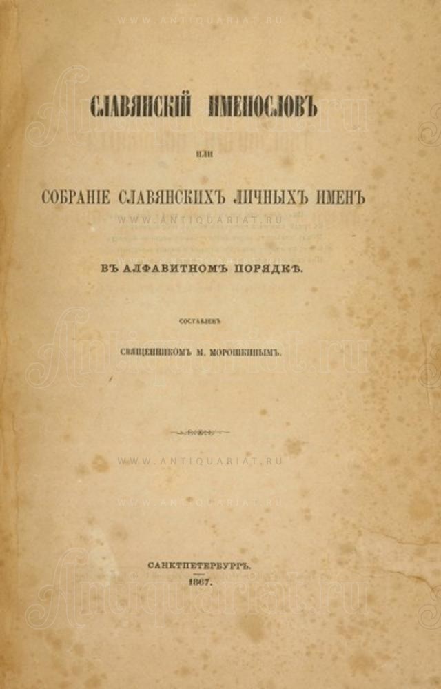 Славянский именослов или Собрание славянских личных имен в алфавитном порядке / сост. свящ. М. Морошкиным. СПб.: В Тип. Второго отд. Собственной Е.И.В. Канцелярии, 1867. 2, 1-14, 17-108, 213 с. В современном цельнокожаном переплете. Золототисненая дублюра, муаровые форзацы. Ошибка в пагинации: после с. 14 следует с. 17. «Лисьи» пятна.