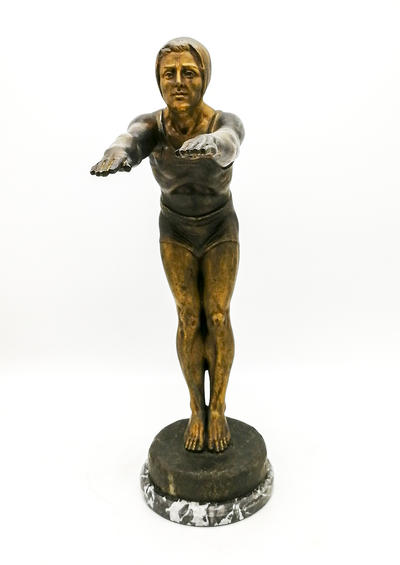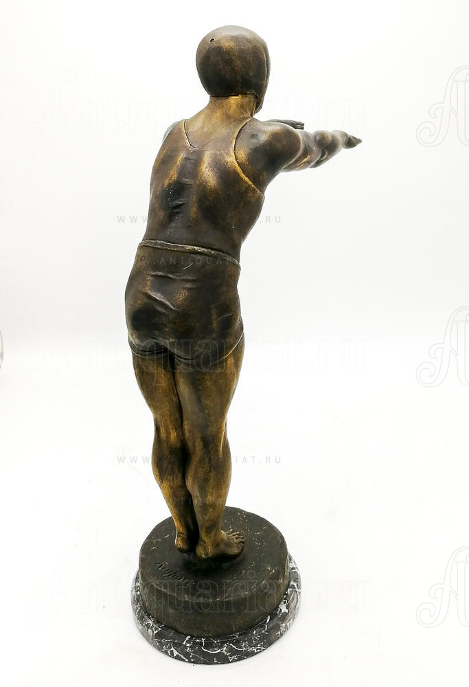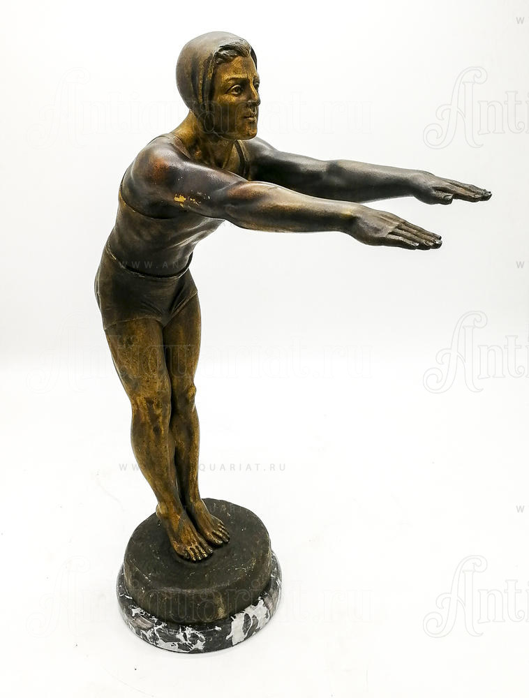 На скульптуре запечатлен пловец, готовящийся к прыжку в воду. Изготовлен из белого метала (шпиатр) методом литья с последующим бронзированием и патинированием. Фигура закреплена на каменном основании. Имеется два клейма в тесте: "FRANCE" и "Rullony"