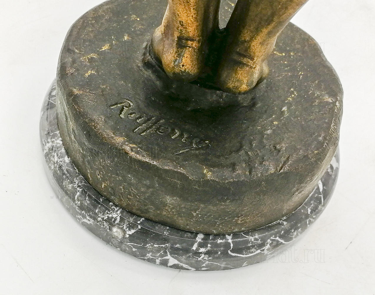 Автор фигуры - скульптор Oscar Ruffony (1874-1946). Оскар Руффони родился 8 января 1874 года в Магадино (кантон Тичино), швейцарский скульптор, работающий во Франции. На самом деле он умер в Париже в 1946 году. Некоторые из его работ, такие как «Э Блерио» 1909 года и «Группа, изображающая победу, увенчанную летчиком» 1914 года, были приобретены Музеем авиации и космонавтики (MAE). Ле-Бурже (самый важный авиационный музей Франции, а также старейший и один из крупнейших в мире), принесший скульптору новую международную и мировую известность.