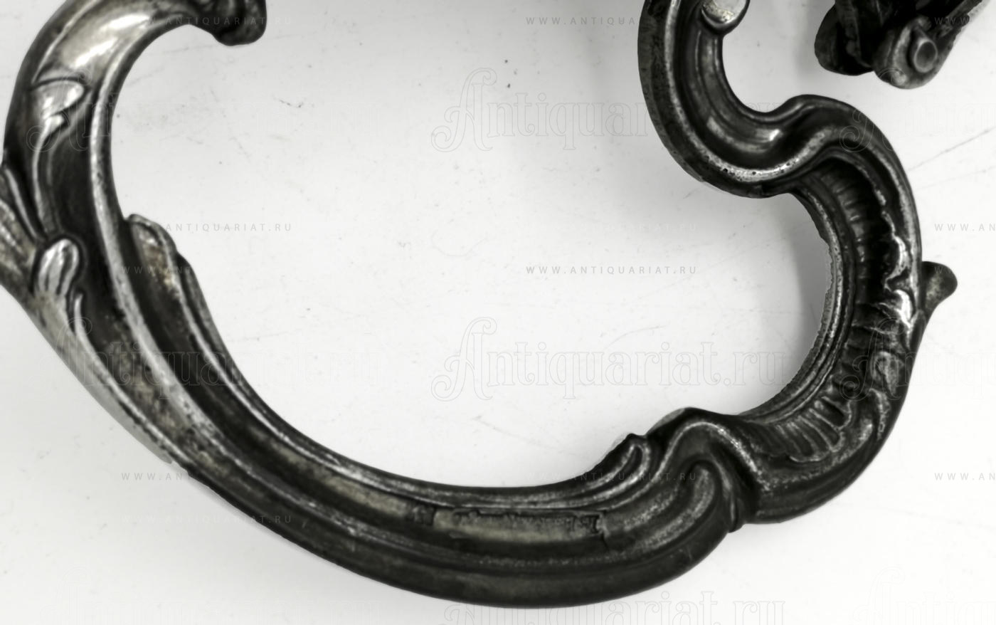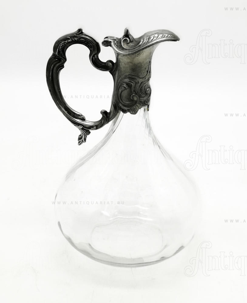Декантер изготовлен из прозрачного стекла, горлышко и ручка выполнены из шпиатра декорированных рокальными орнаметами. Горлышко с откидной изогнутой крышечкой сделано из шпиатра и украшено рельефными завитками. Декантер изготовлен в Бельгии в ХIХ в. Он станет отличным подарком ценителю вин. Прозрачное стекло позволит оценить цвет напитка, а приподняв крышечку, можно насладиться его запахом
