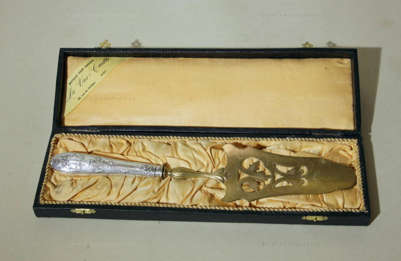 Ручка лопатки изготовлена из серебра, рабочая часть - позолоченная сталь с гравировкой.