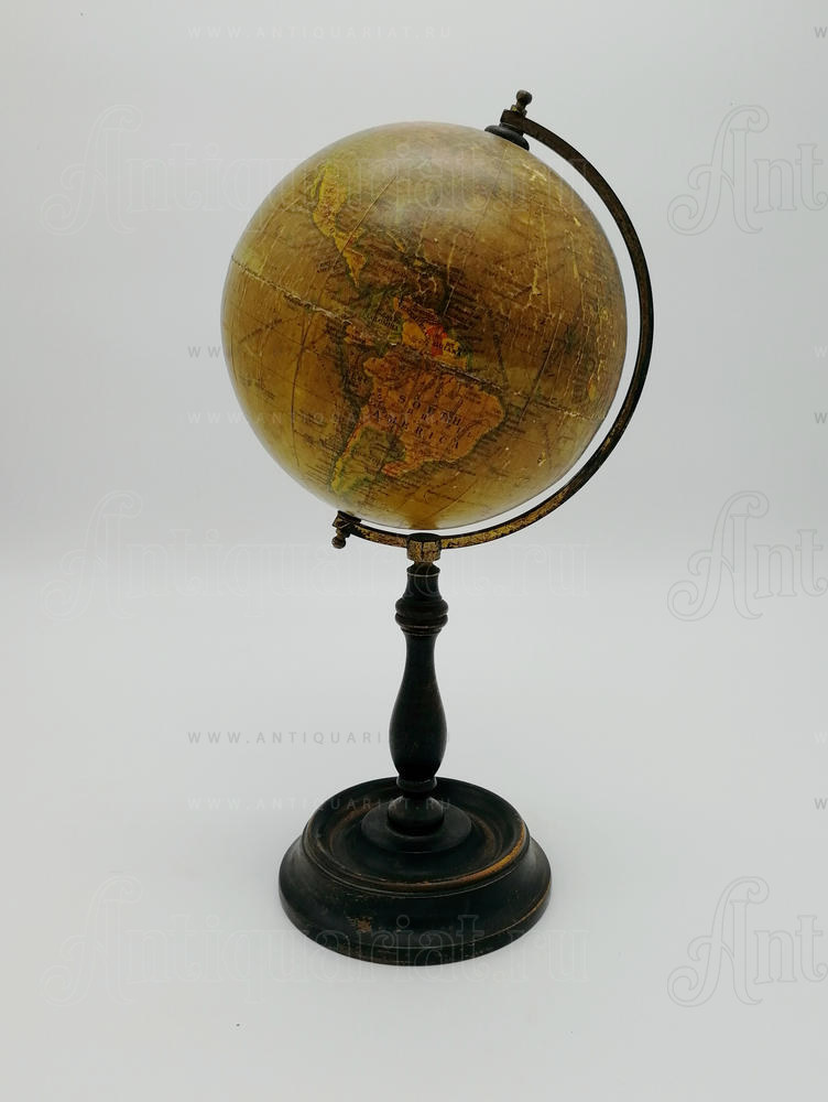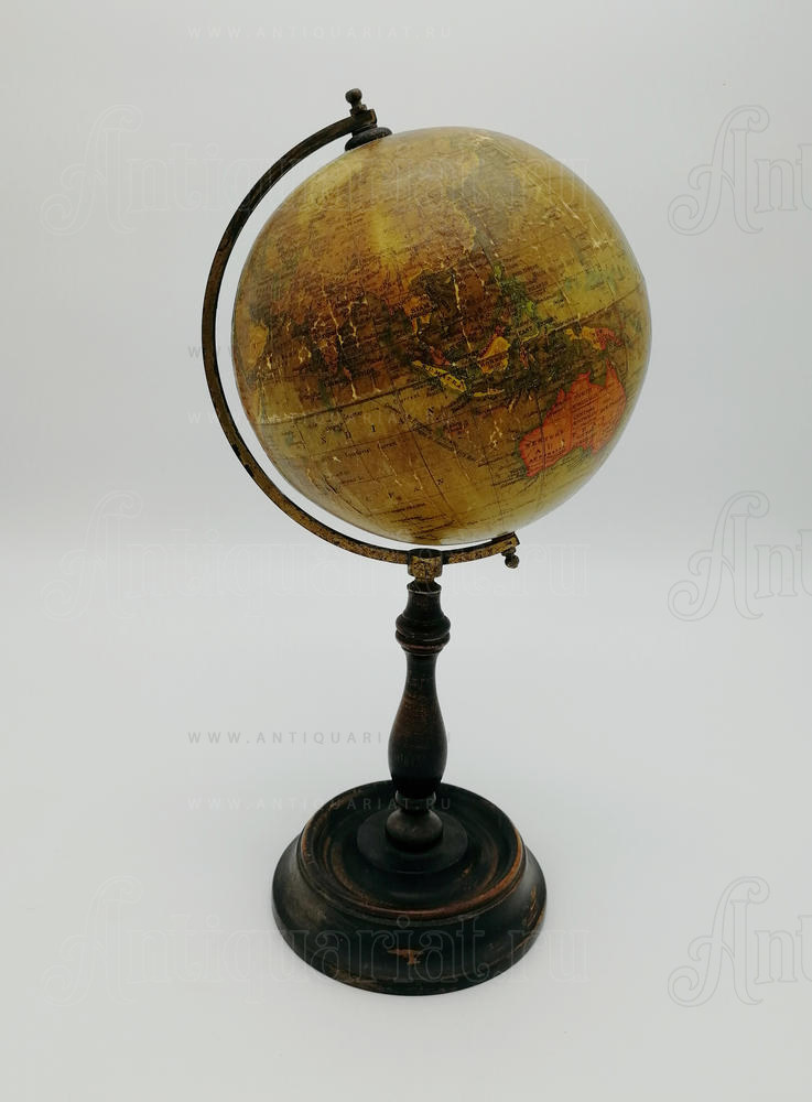 Подставка и сфера выполнены из дерева. Изображение имеет потертости характерные возрасту предмета.