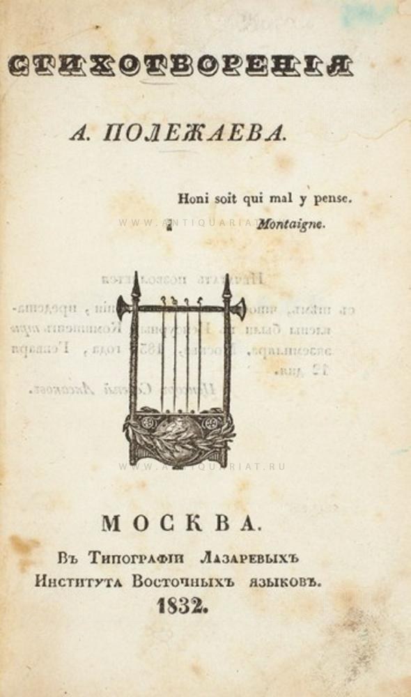 [Первая книга] Полежаев, А. Стихотворения. М.: В Тип. Лазаревых Института Восточных Языков, 1832. 284, IV с. В современном цельнокожаном переплете, стилизованном под переплет эпохи, золототисненая дублюра, форзацы узорчатой бумаги. «Лисьи» пятна в блоке.