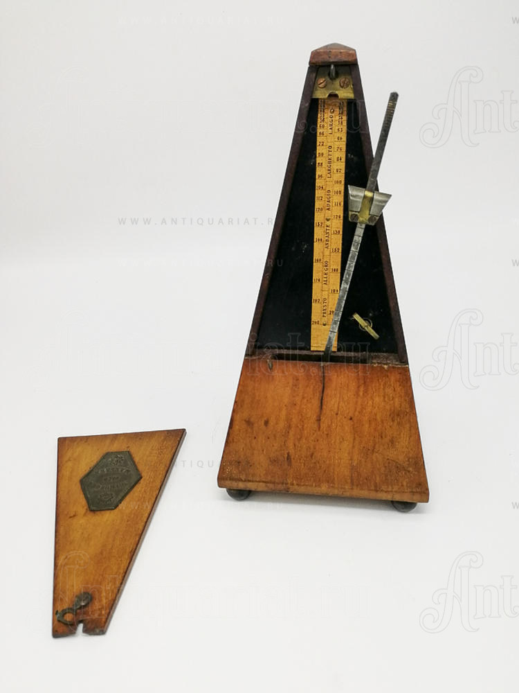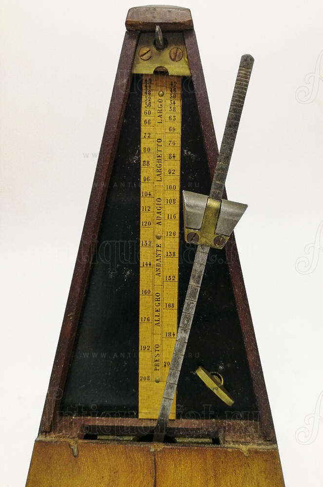 Имеет комбинацию с колокольчиками на 5 позиций. Устройство имеет достаточно большой резонанс. На лицевой стороне табличка "METRONOME NACH MAELZEL" (Фирма Maelzel). Корпус изготовлен из древесины орехового дерева.