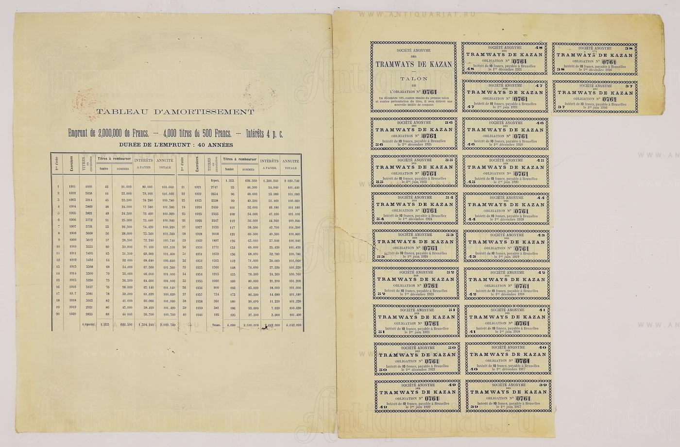 Олигация на предъявителя "Трамваи казани" в 500 франков. №0761. На французком языке.