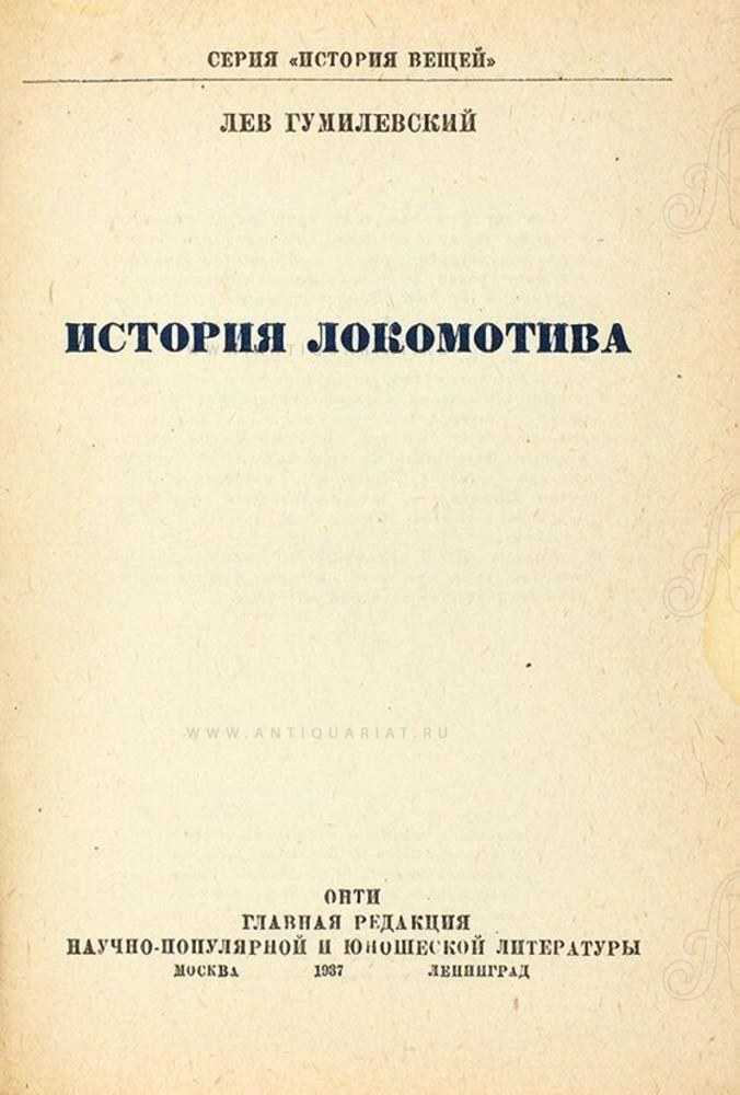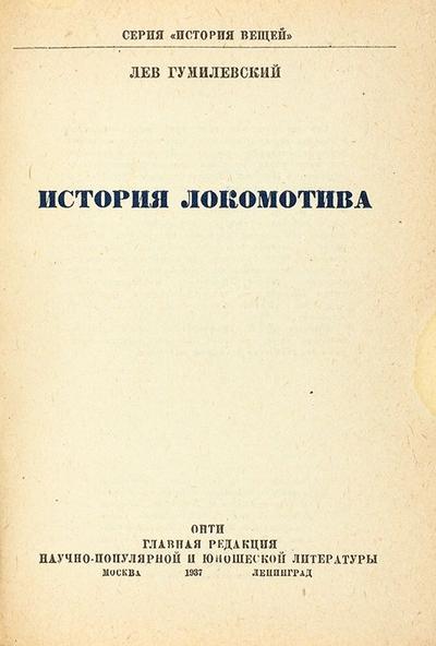 Гумилевский, Л.И. История локомотива / Лев Гумилевский. М.; Л.: ОНТИ, Глав. ред. науч.-попул. и юношеской лит-ры, 1937. — 216 с.: ил.