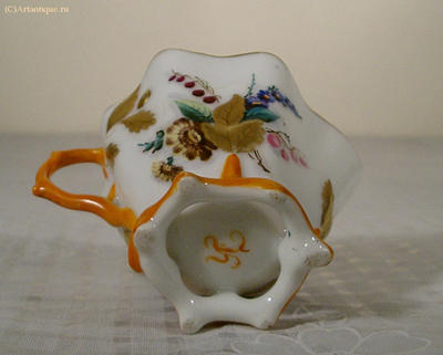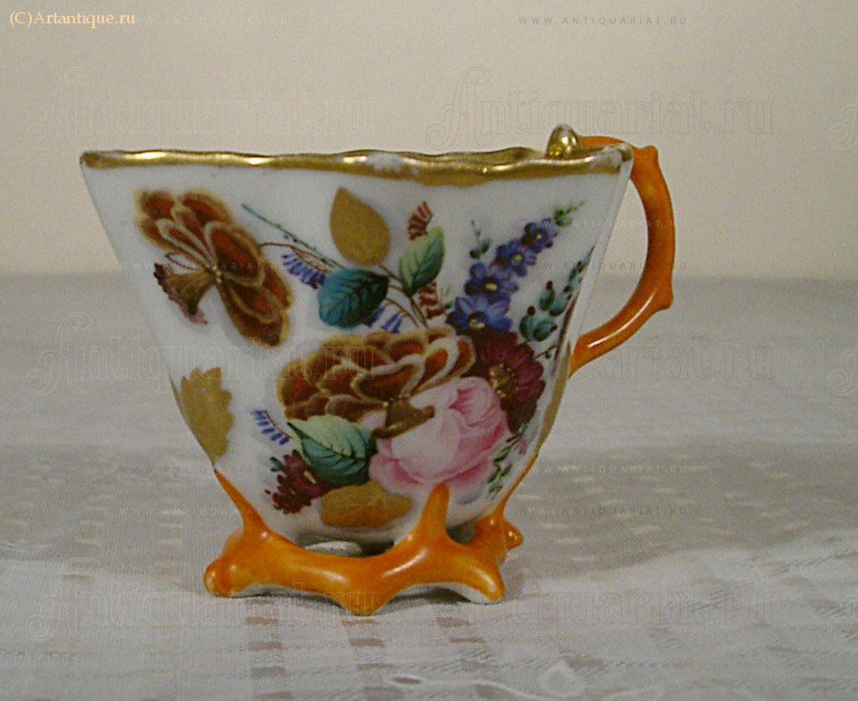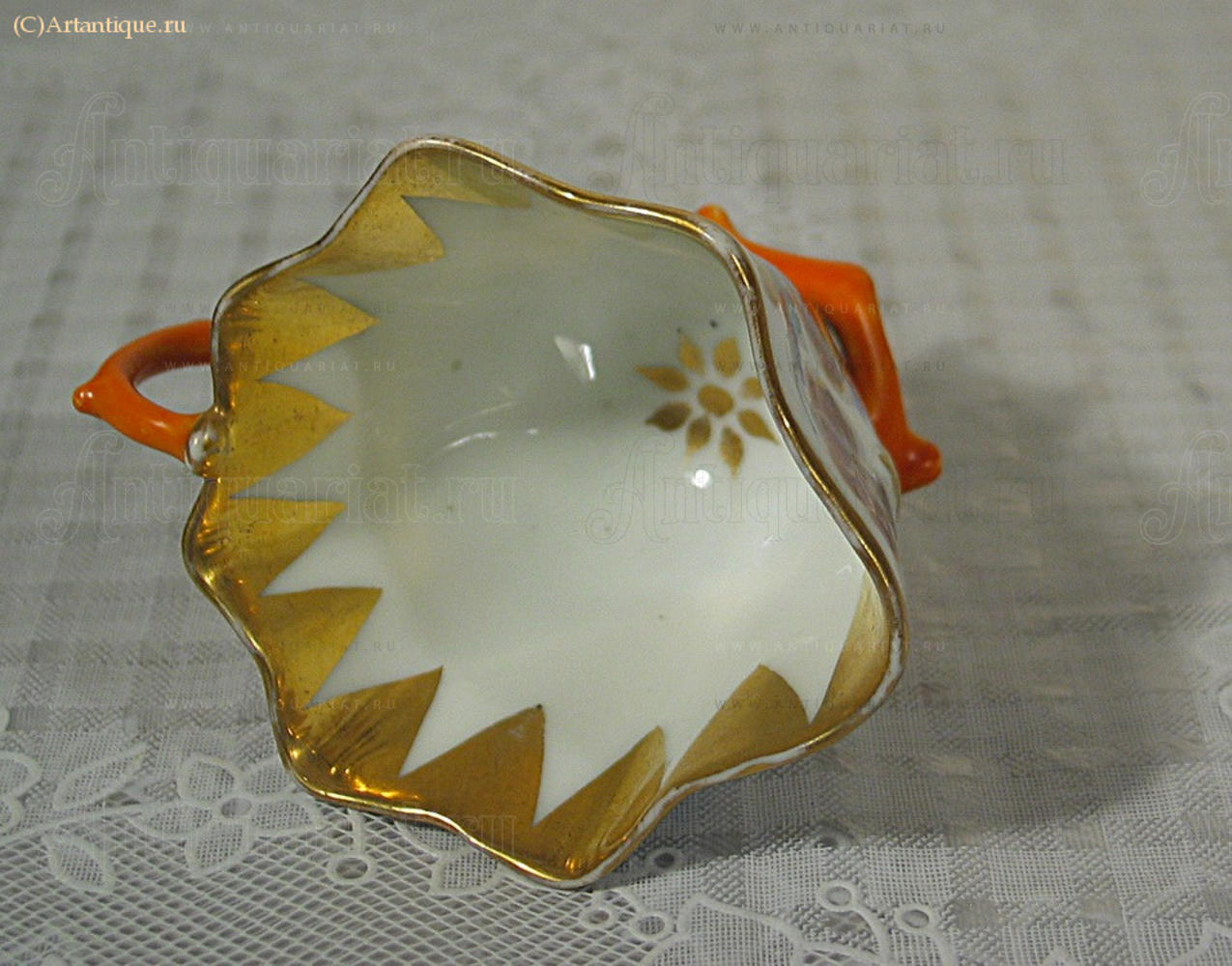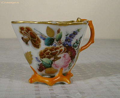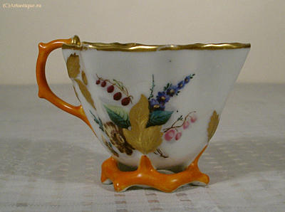Необычная чашка в стиле второго рококо, стиля пышного и эклектичного. Ручка и основание в виде коралла, полихромная цветочная роспись с золочёными листьями и золотой же подрисовкой. Внутри чашки, также золотом, выполнена стилизация: на дне – цветок, по краям – «лучи солнца».