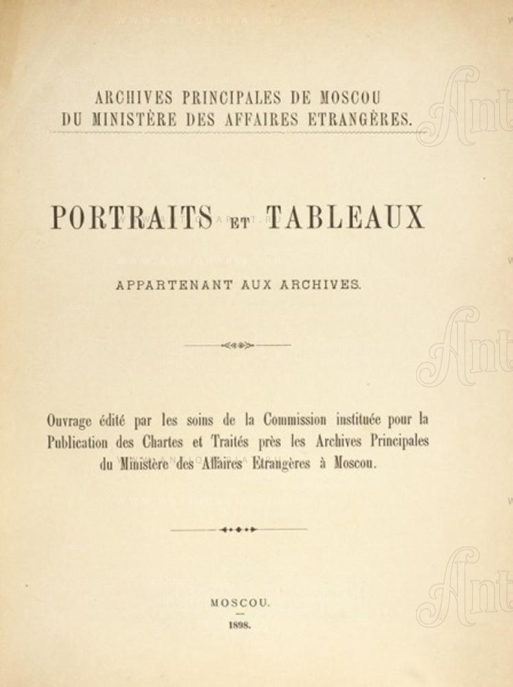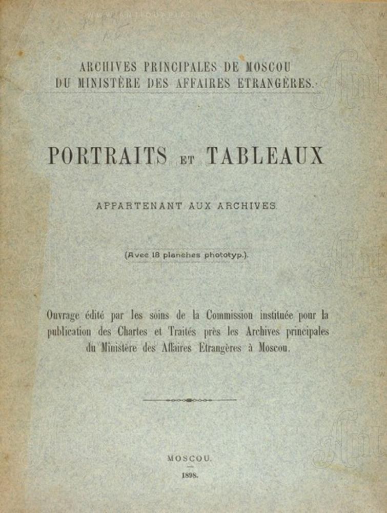 Портреты и картины, принадлежащие Архивам. Альбом под редакцией Комиссии по публикации уставов и договоров из Главного архива Министерства иностранных дел в Москве. [Portraits et tableaux appartenant aux Archives. Ouvrage йditй par les soins de la Commission institutйe pour la publication de chartes et traitйs prиs les Archives principales du Ministиre des Affaires йtrangиres а Moscou. На франц. яз.]. М.: Тип. Г. Лисснера и А. Гершеля; Фототип. Шерер, Набгольц и К°, 1898. 26 с., 18 л. ил., портр.