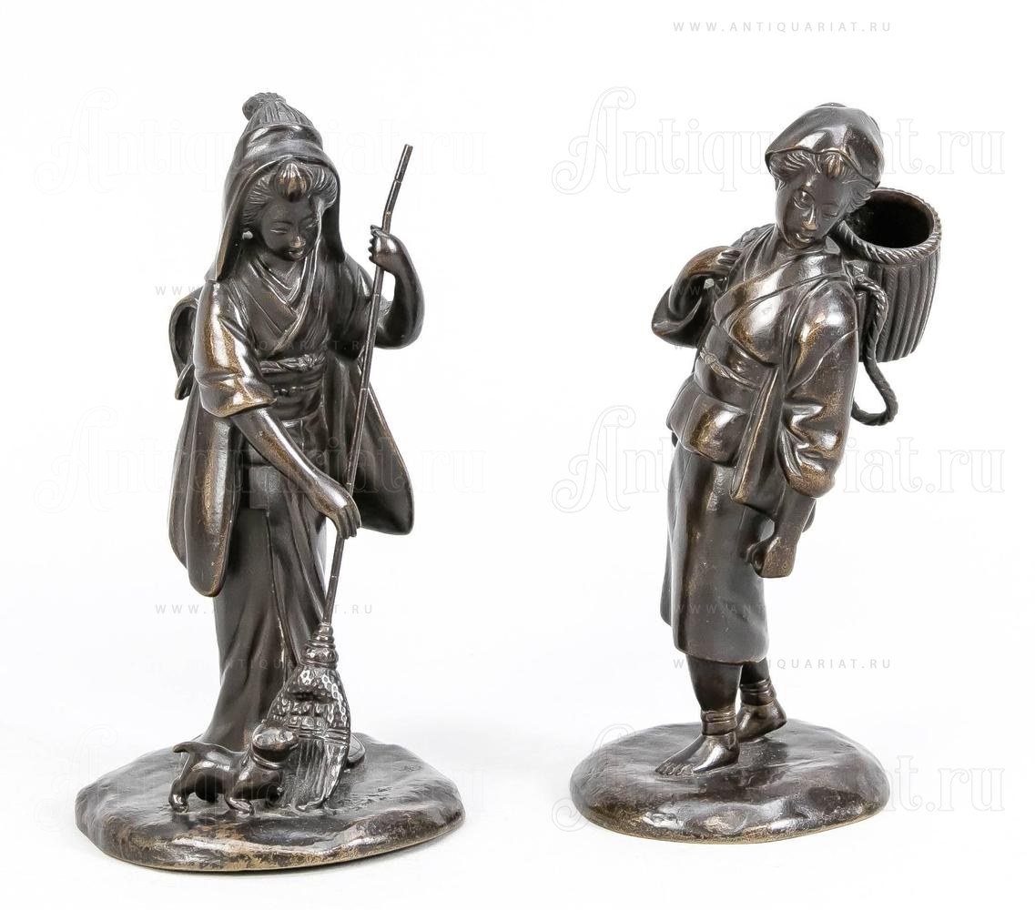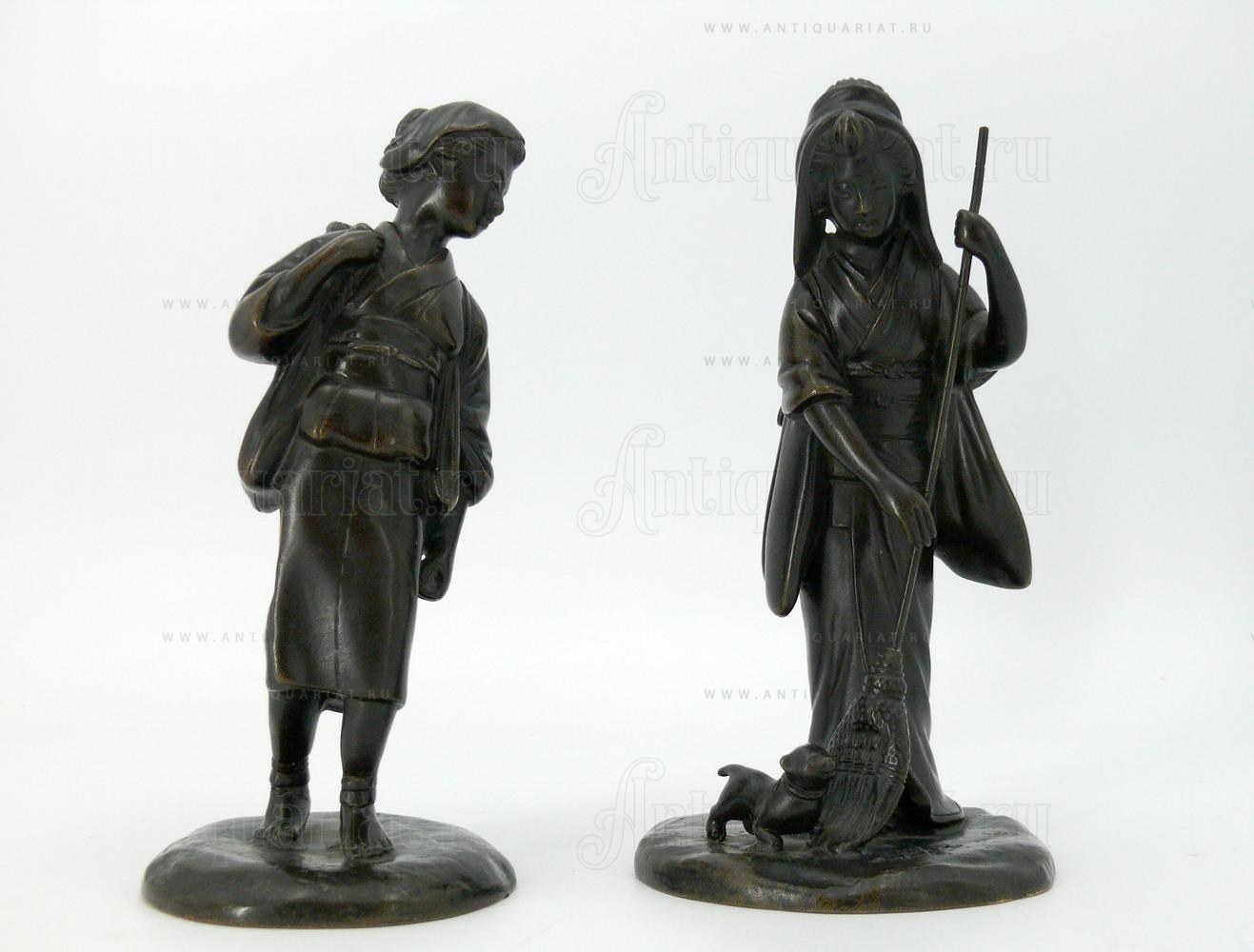 В паре настольных скульптурах с характерной японской тонкостью передана грация и динамика японских девушек выполняющих различные работы в быту - одна подметает пол, рядом сидит котенок, вторая несет корзину с поклажей.