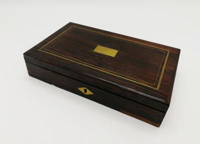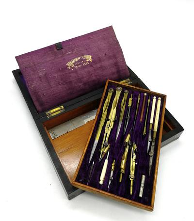 Инструменты выполнены из бронзового сплава, рабочие части стальные. Хватки на рейсфедере и отвёртке из слоновой кости. Футляр облицован палисандром и инкрустирован бронзовыми вставками. Ключ от футляра утрачен.