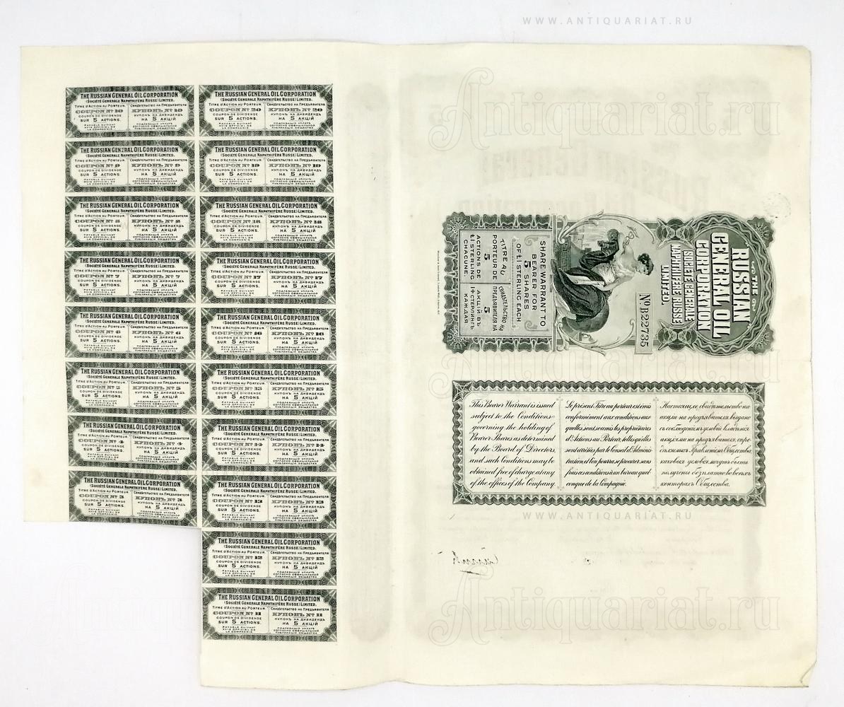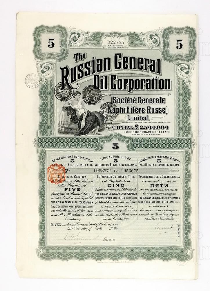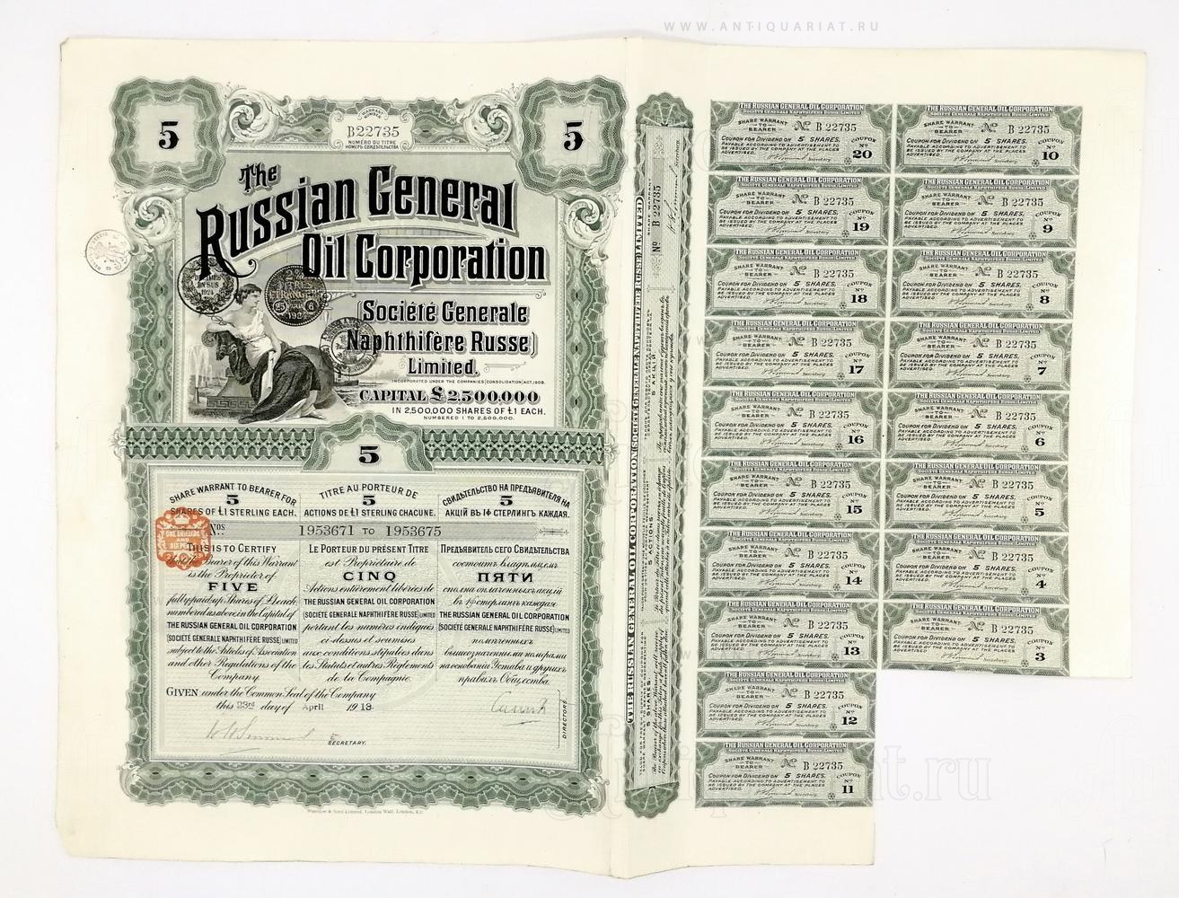 Пять акцiй "The Russian General Oil Corporation" (Российская Генеральная Нефтяная Корпорация) 1 фунт стерлинг каждая. С №195367 по №1953675