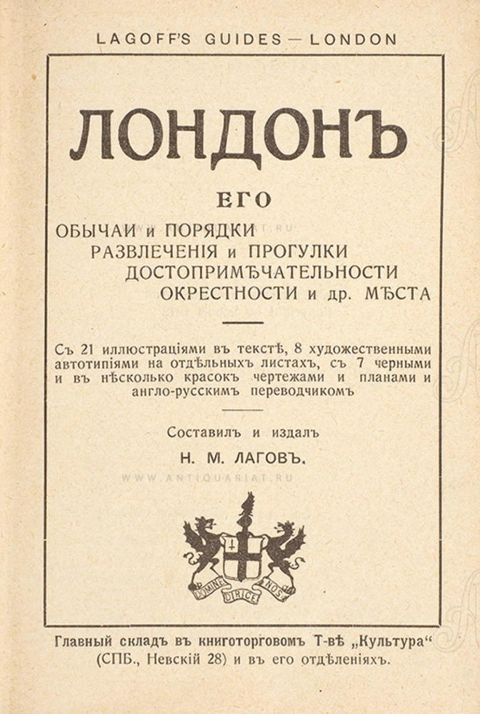 [Дверные молотки для разного сорта посетителей] Его обычаи и порядки, развлечения и прогулки, достопримечательности, окрестности и др. места. С. 21 иллюстрациями в тексте, 8 художественными автотипиями на отдельных листах, с 7 черными и в несколько красок чертежами и планами и англо-русским переводчиком / сост. и издал Н.М. Лагов. СПб.: Главный склад в книготорговом Т-ва «Культура»; «Русская Скоропечатня», [1912]. XIII, [5], 347 с., 4 л. ил.: ил., 2 л. схем., 3 л. рекл. объявл. 16,2x11,2 см. В издательском коленкоровом переплете с золотым и художественным тиснением по передней переплетной крышке и корешку. В хорошем состоянии, потертости. Ляссе. Блок преимущественно чистый, редкие пятна, заломы нескольких страниц.