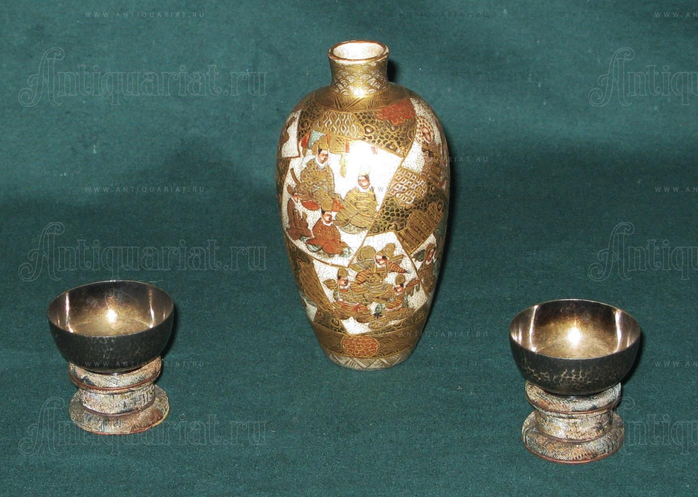 В комплект входит сосуд для сакэ и две серебряные чарки на подставках.