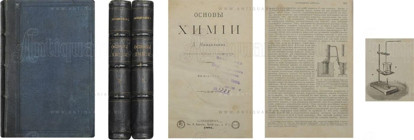 Менделеев, Д. И. Основы химии / [соч.] Д. Менделеева, проф. И. С.-п.-б. ун-та. - 4-е изд.: [в 2 ч.]. СПб.: тип. В. Демакова, 1881-1882. Т. 1. XVI, 544 с.: ил.; Ч. 2. 545-1160 с.: ил.