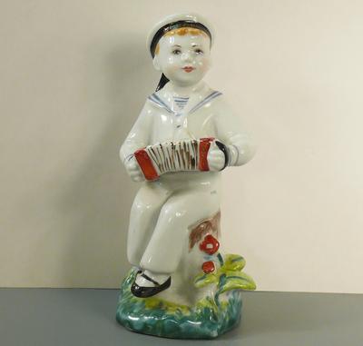 Мальчик в матросском костюмчике играет на гармошке. На бескозырке надпись "Смелый".