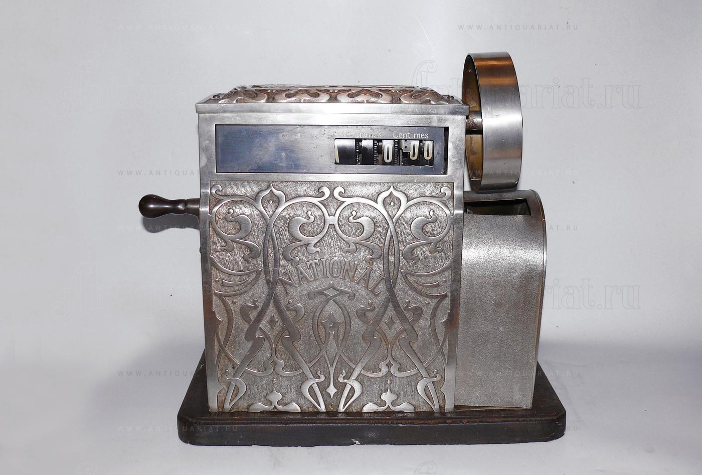 Кассовый аппарат на деревянном основании с полностью рабочим механизмом. Корпус изготовлен из бронзы, частично никелирован.