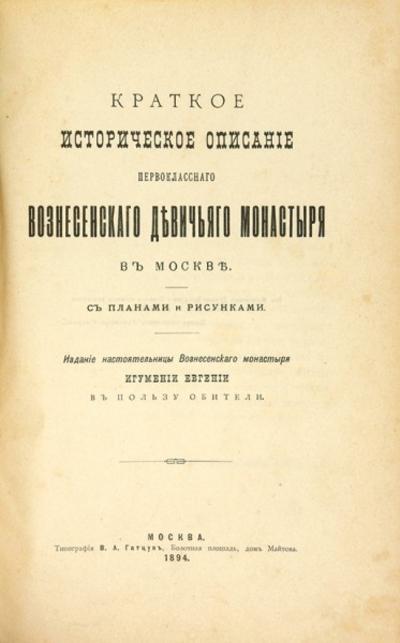 Краткое историческое описание Первоклассного Вознесенского Девичьего монастыря в Москве. С планами и рисунками. М.: Тип. В.А. Гатцук, 1894. [2], 140 с., ил., план. В коленкоровом переплете эпохи с золотым и блинтовым тиснением. В хорошем состоянии.