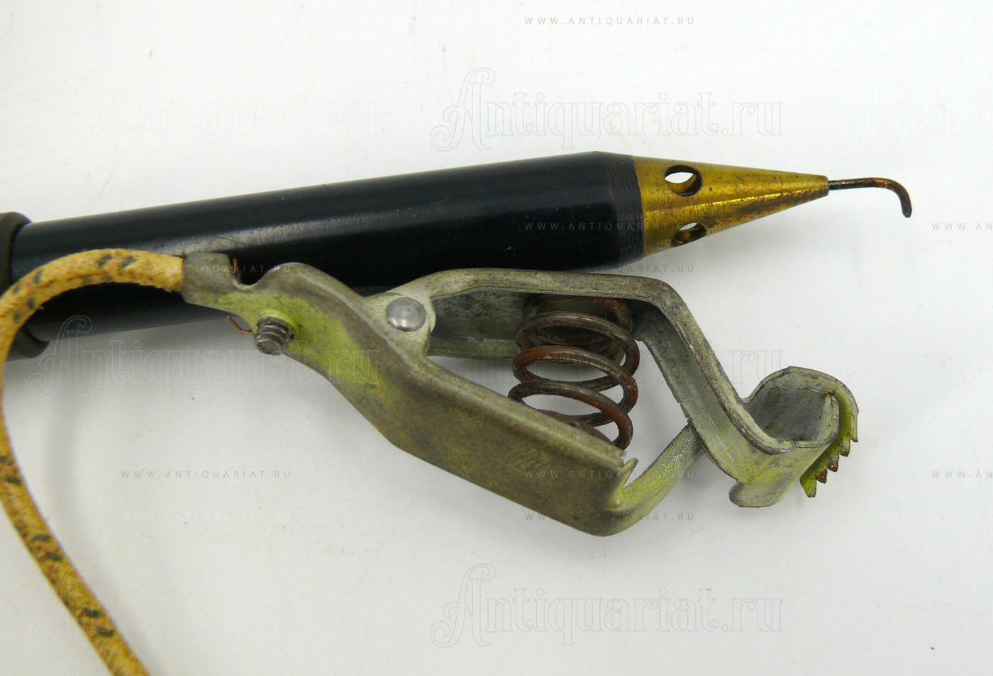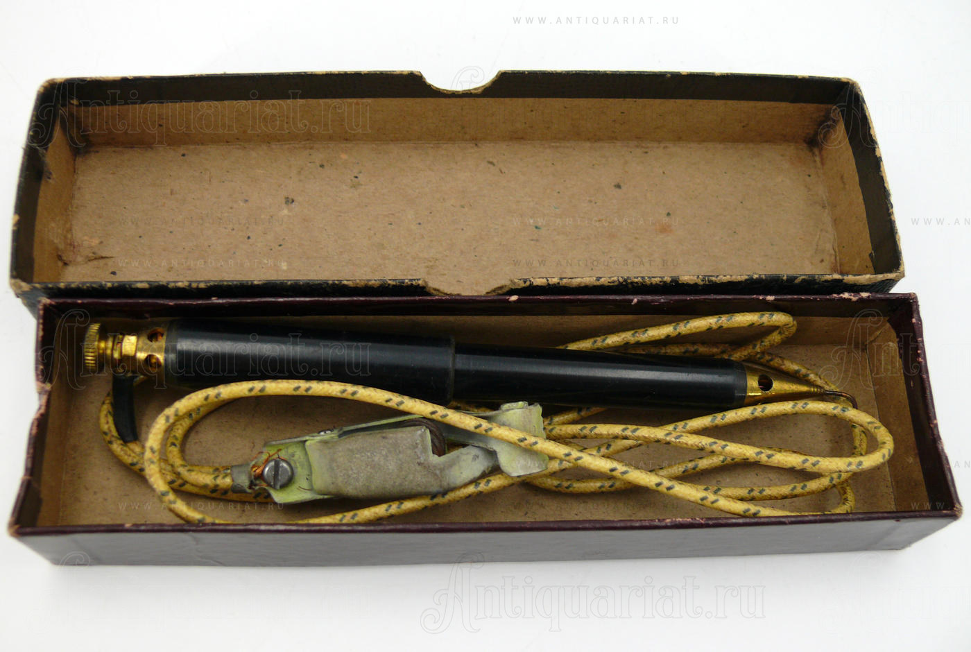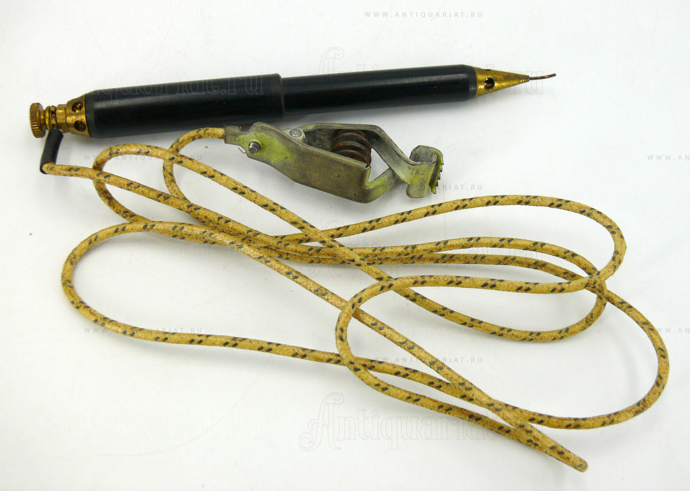 Длина 7 дюймов, шнур 3 фута с зажимом на конце, корпус крутится, как у механического карандаша, продвигая вперед медный пишущий наконечник. Подключается к трансформатору 110 -> 6 вольт