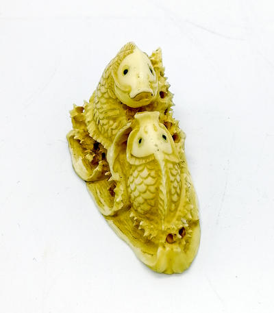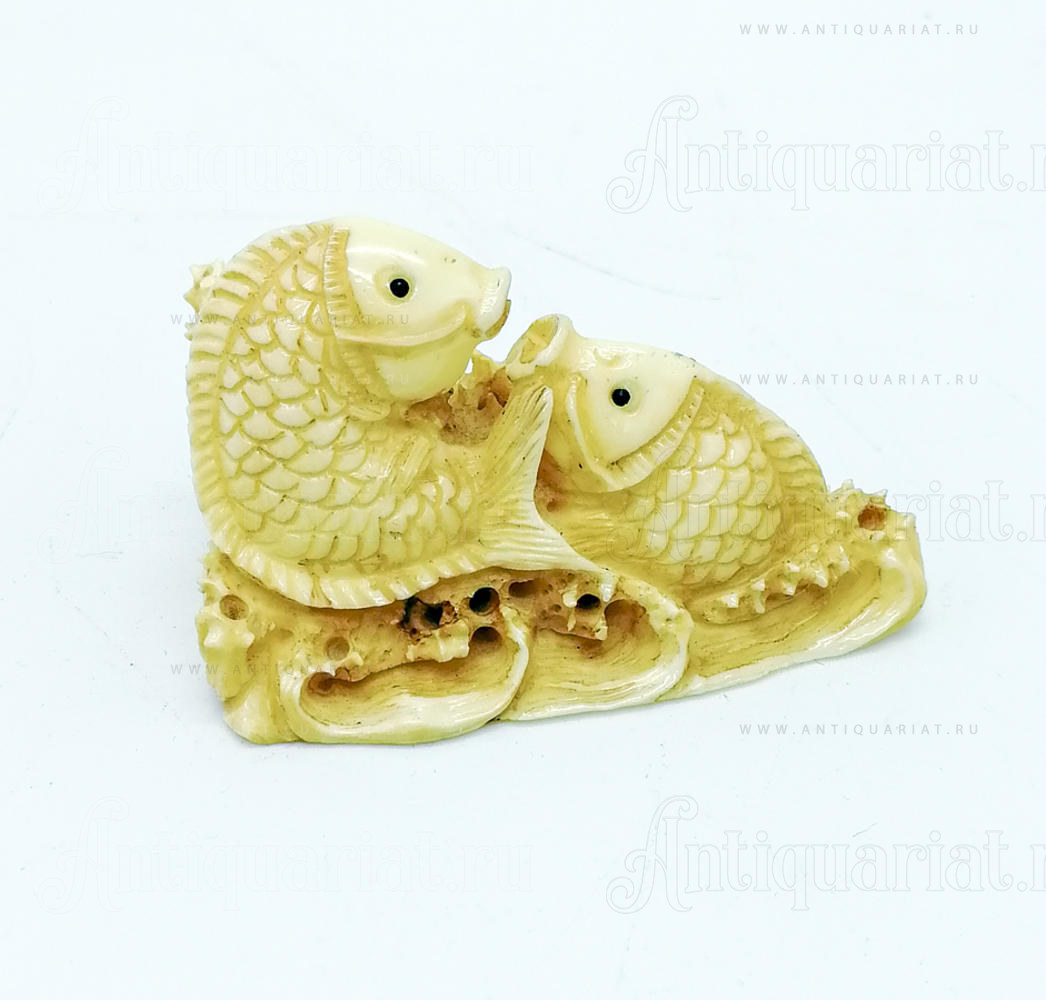 Нэцке типа Катабори (в виде трехмерной фигурки). Работа имеет авторскую подпись и отличается высоким уровнем исполнения мелких деталей композиции. Выполнена, вероятнее всего, во второй половине 19 века. В хорошей сохранности.