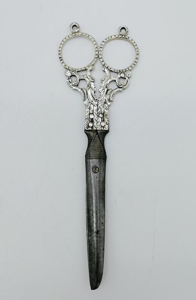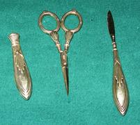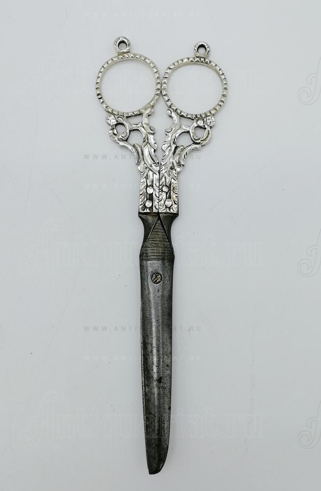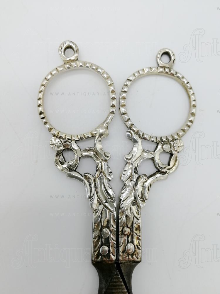 Ручки и кольца выполнены из серебра с рельефной проработкой в виде растительного орнамента. Режущие полотна изготовлены из кованной закалённой стали.