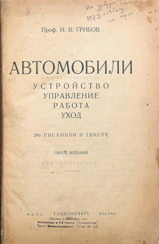 Грибов, И. В. Автомобили: Устройство. Управление. Работа. Уход: С 280 рис. в тексте / Инж. И. В. Грибов; Моск. подотд. проф.-техн. образования (Москпрофобр). — 5-е изд.