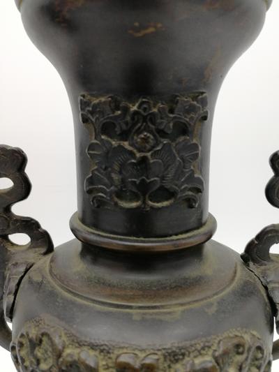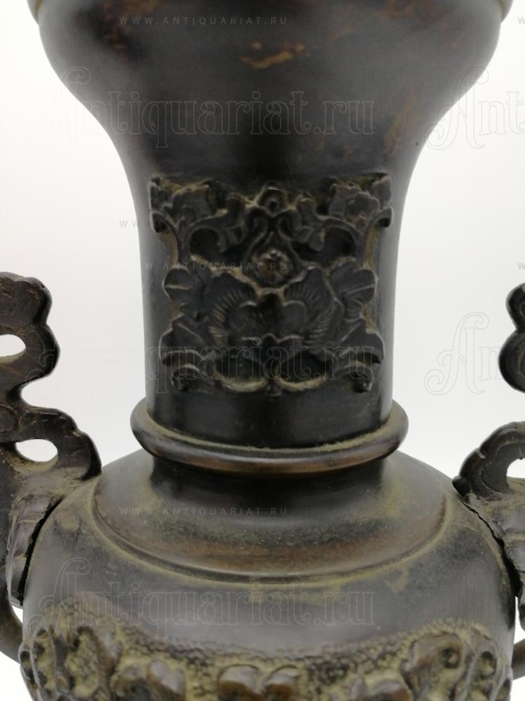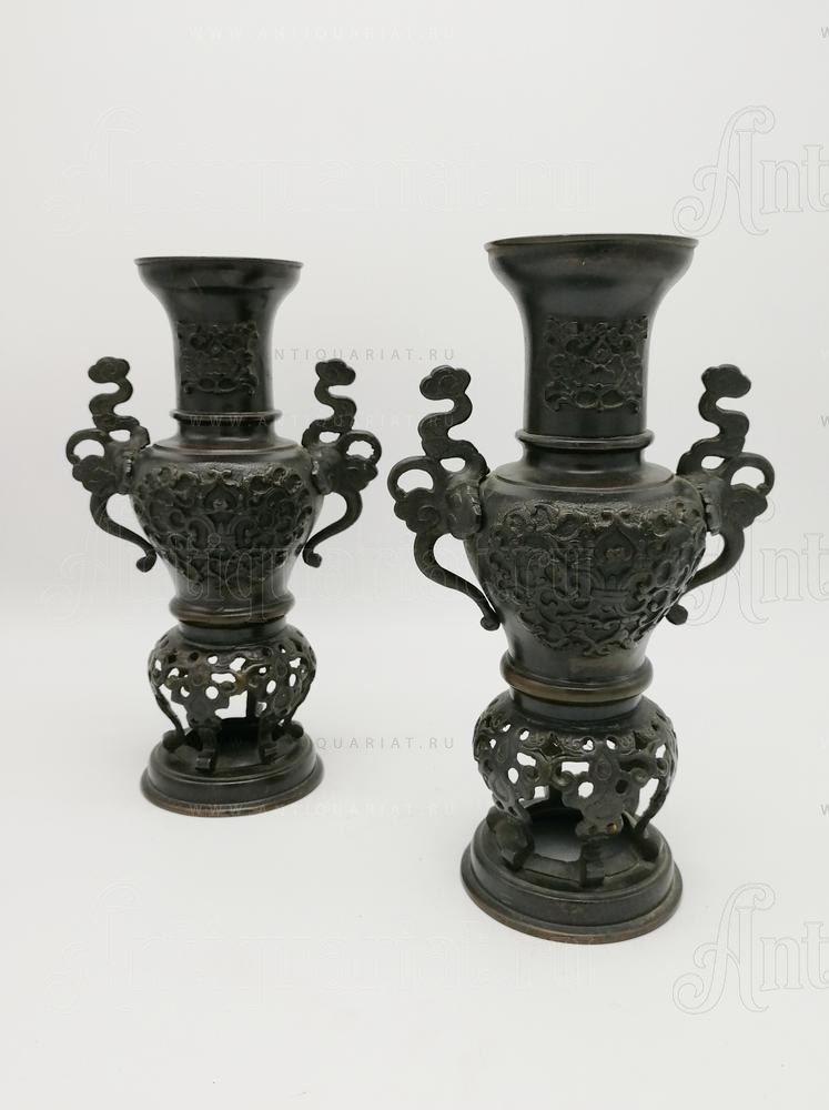 Вазы декорированы растительным орнаментом изготовлены из литой бронзы с прочеканкой и патинированием.