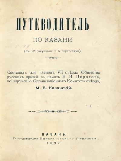 Казанский, М.В. Путеводитель по Казани. Казань: Типо-лит. Имп. университета, 1899. X, 298, 77 с., ил., 2 л. план.