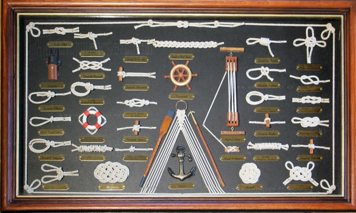 Инсталляция с образцами морских 30 узлов используемых для создания такелажа судов. Таблички на французском языке.