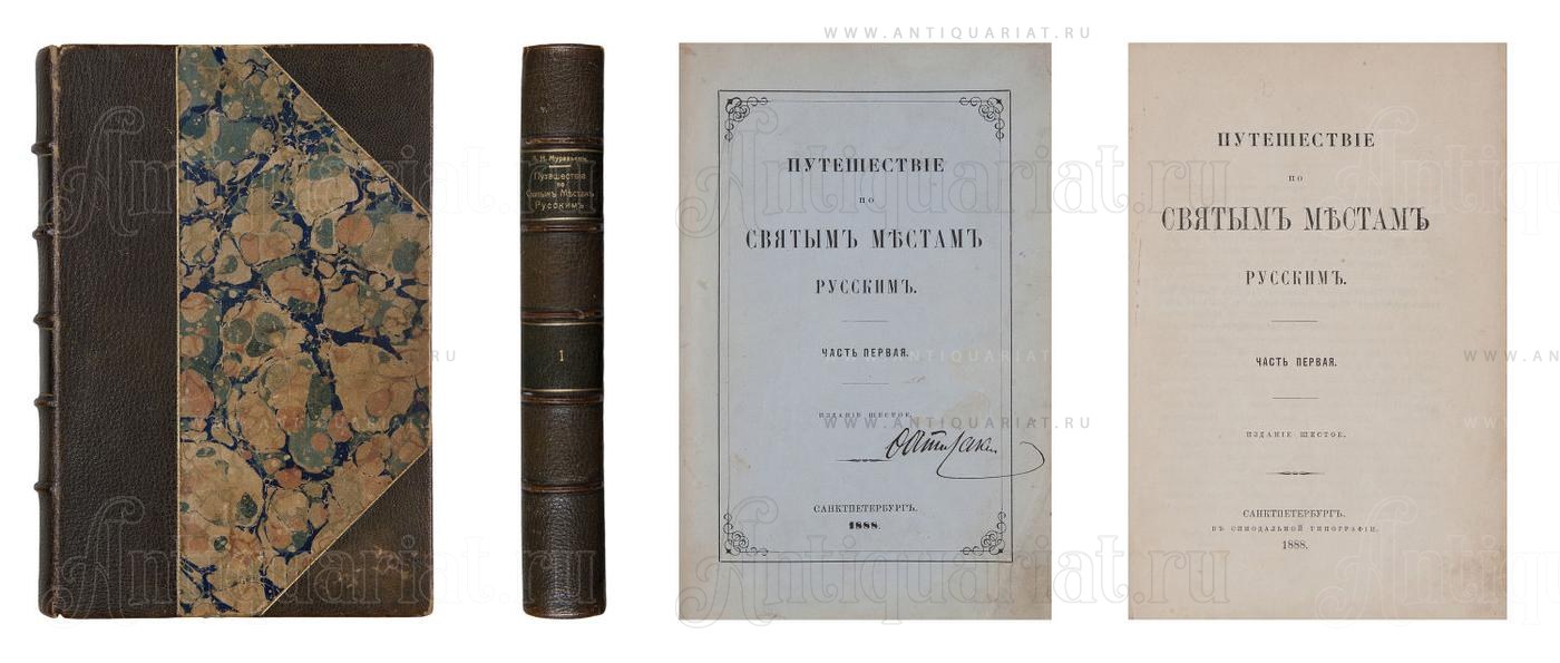 В составном индивидуальном переплёте эпохи. Крышки оклеены «мраморной» бумагой«. Корешок и углы из темно-зеленой кожи. На корешке пять бинтов; тиснением золотом: фамилия автора, название издания и номер тома. Составные форзацы из бумаги под «павлинье перо». Тонированный красный обрез. Орнаментированная издательская обложка сохранена в переплете. Хорошая сохранность. Небольшие потертости переплета, экслисбриса на переднем форзаце стерт, роспись на 1 с. обложки, бледный развод от воды, начиная со с. 641 и до конца, а также на 3 с. обложки, небольшие следы плесени на с. 641-657. Без ч.2. Издание русского духовного писателя, поэта, драматурга, церковного и общественного деятеля Андрея Николаевича Муравьева (1806-1874).