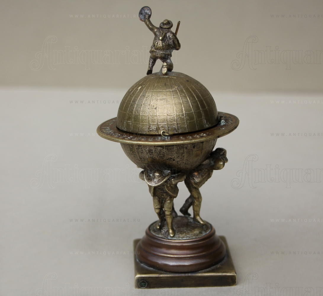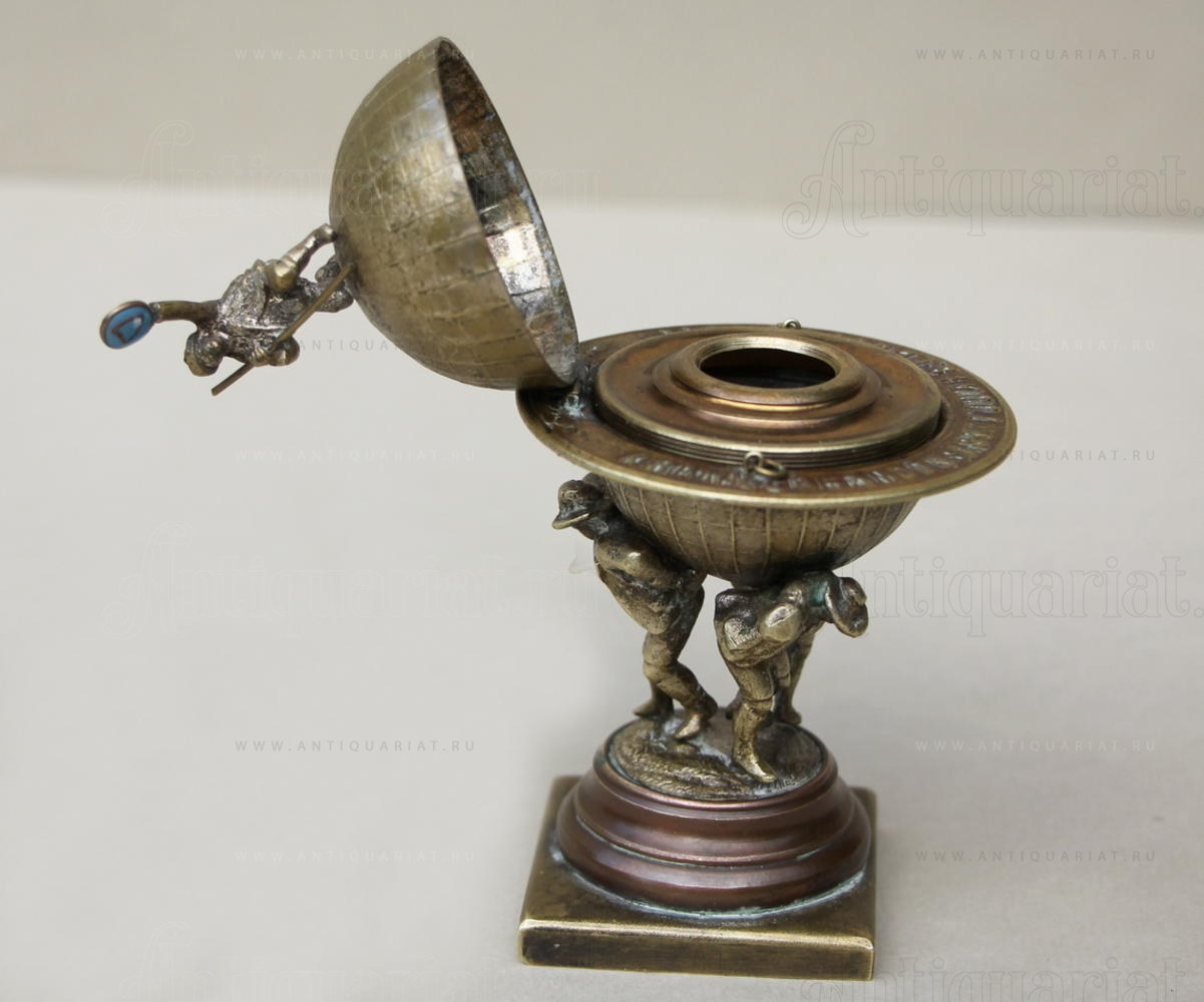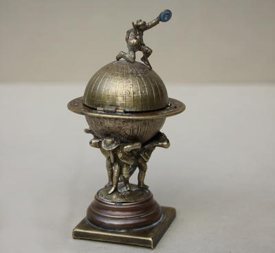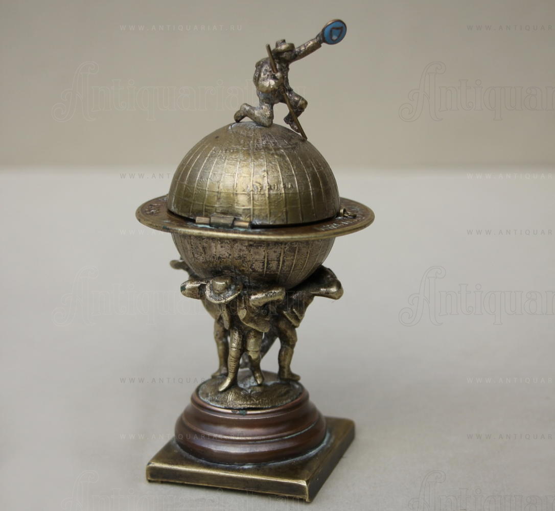 Чернильница выполнена в виде земного шара, стоящего на трёх туристах, с ликующим туристом на самой верхней точке.