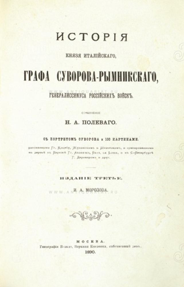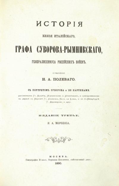 Полевой, Н. А. История князя италийского, графа Суворова-Рымникского, генералиссимуса российских войск / Н. А. Полевой. 3-е изд. М.: Издание И. А. Морозова, 1890. XII, 13-327 c., ил.