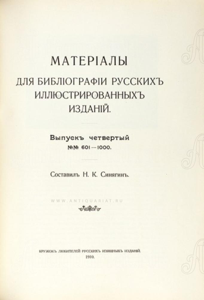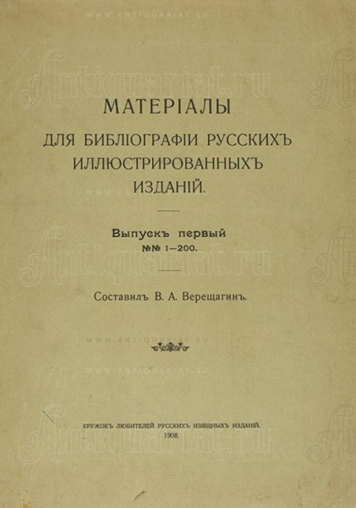 Материалы для библиографии русских иллюстрированных изданий / сост. В.А. Верещагин. В 4 вып. Вып. 1-4. СПб.: Кружок любителей русских изящных изданий, 1908-1910.