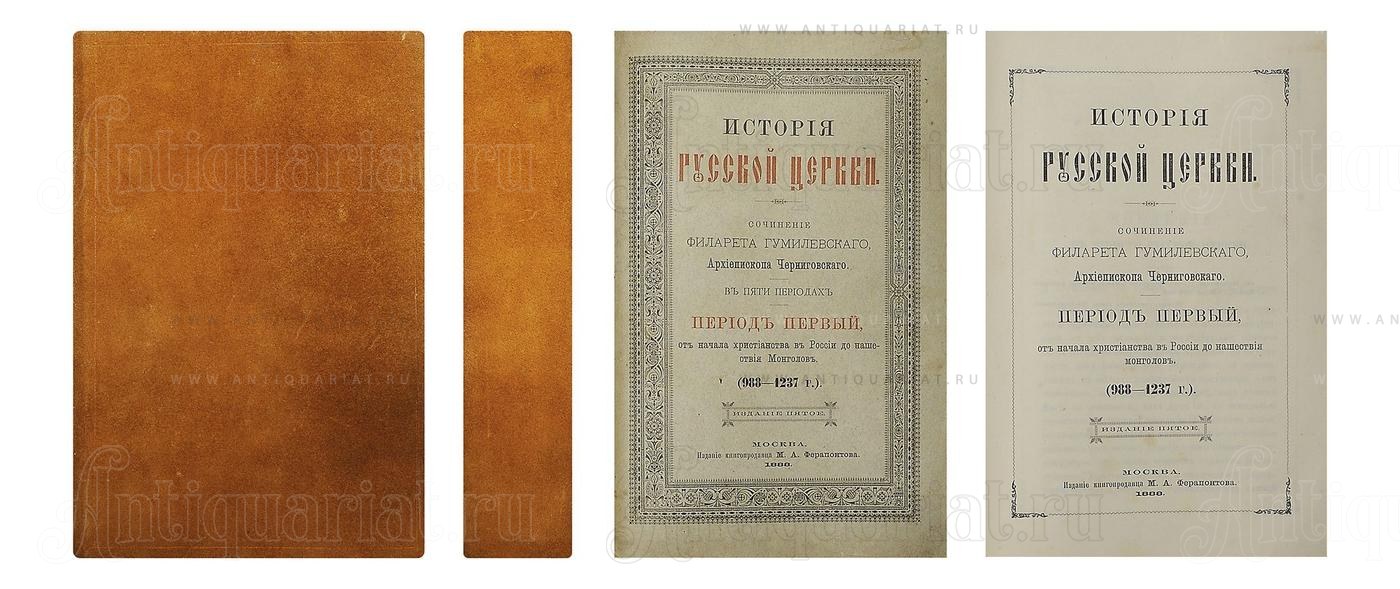 История русской церкви / соч. Филарета, архиепископа Черниговского: [в 5 периодах]. — 5-е изд. М.: М.А. Ферапонтов (Период 2-5-й), тип. М.Г. Волчанинова, 1888. — Период первый: От начала христианства в России до нашествия монголов: (988-1237 гг.) [4], XII, 17- 273 с.; Период второй: Монгольский, от опустошения России монголами до разделения митрополии: (1236-1410 гг.) 185, [3] с.; Период третий: От разделения митрополии до учреждения патриаршества: (1410-1588 г.) 266 с.; Период четвертый: Период патриаршества. (1588-1710 г.) 327, IV с.; Период пятый: Синодальное управление: (1721-1826 гг.) 234 с.; Каждая страница текста в орнаментированной рамке